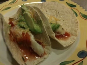 That night, I decided to make fish tacos (the photo is not very appetizing and I apologize). I used orange roughy, which wasn’t the best choice…but when Mahi Mahi isn’t available, I guess it’s what you have to use. They were tasty, but I won’t lie, I was still full from that burrito.