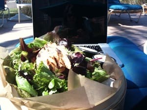 The food was excellent, it was just the timing that was not so excellent. The day started out like yesterday: a veggie omelet with fresh squeezed OJ and wheat toast. We started shooting today for the conference. Lunch time rolled around and we decided to grab some food rather than graze on cookies and brownies. So where do we eat, but Quench. What do I eat? Blackened grouper…on salad this time.