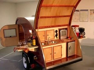 Want to tailgate in style? This ‘Ultimate Camper’ will turn some heads. It’s a cedar-lined deluxe teardrop camper-trailer that’s totally tricked out with a camper’s galley including double sinks, water pump, mini fridge, wine rack and side tables. It’s wired for electricity and includes a TV/DVD player, too.