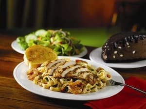 It features three courses for $10.99, including an appetizer, entrée and dessert chosen from a list of menu items. Calling it “The Economical Way to Stuff Your Face,” guests can put a meal together like the one pictured (right), including a Garden Salad appetizer, Cajun Chicken and Shrimp Pasta entrée, and Death by Chocolate dessert. Or, they may choose from a variety of other appetizers including Boneless Buffalo Wings, Mozzarella Cheese Sticks, Fajita Chicken Quesadillas, Southwest Egg Rolls, or Baked Potato soup.