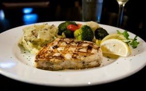 And the Local Swordfish—a house specialty—is served with a citrus stonefruit salsa.