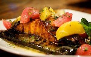 The Cedar Plank Salmon (click for recipe) is seared in sake and soy, marinated with a fruit Beurre Blanc, and served on a cedar plank that was milled to Hirsty’s specifications.