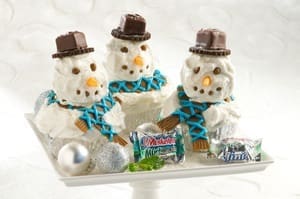 To make hat, microwave wafer cookies 5 seconds and cut rounds using 1-inch biscuit cutter. Secure one 3 MUSKETEERS® Brand Mint with Dark Chocolate Minis to center of each round with frosting. Top the Snowman with his candy bar hat… |