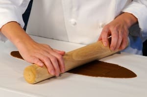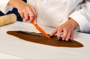 Roll out dark chocolate colored fondant lengthwise to 1/8-inch thickness. Cut 8-inch x 3-inch rectangle; combine scraps and roll for second 8-inch x 3-inch rectangle. |