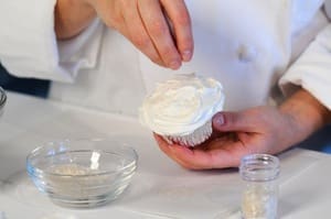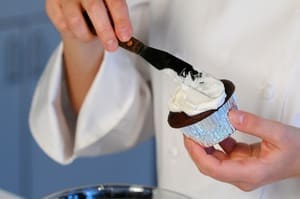 | Continue filling each cup with batter to 2/3 full. Bake mini cupcakes for 16 – 18 minutes and standard cupcakes for 24 – 26 minutes or until toothpick inserted in cupcakes comes out clean. Cool completely. | ![]() |
