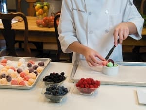 As we join Erica, she has already baked the graham cracker crust in the ramekins, and has let it cool. She has assembled her sorbet (keeping it on ice), and berries.