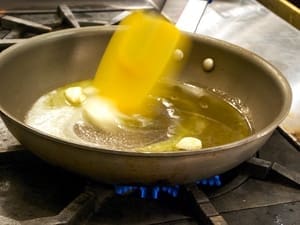 In a large skillet, heat the butter and olive oil with the garlic clove until it starts to sizzle.