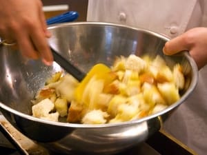 In a large bowl, pour oil mixture over bread cubes, and toss.