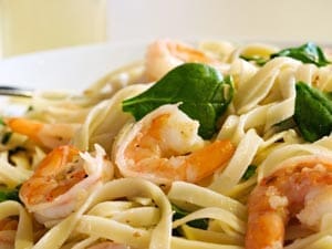 Return shrimp to skillet along with spinach, cooked fettucini, and reserved cooking liquid as needed to keep pasta moist.