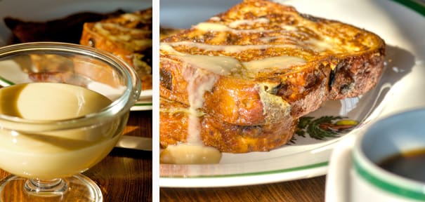 We make our Egg Nog Rum French Toast with thick-sliced cinnamon swirl raisin bread, cinnamon sugar, eggs, eggnog, nutmeg and a little dark rum. It’s rich and rewarding, sure to warm you up on a cold morning. Serve it with maple syrup…