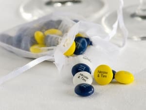 - Don’t forget supplies – the details count, so be sure you have cups, plates, salad bowls, utensils, napkins, tablecloths – and do everything you can ahead of time. For November’s shower we’re going Italian, with checked tablecloths, dripped candle centerpieces, and everything in red and white. Think about how to individualize the event, too – like with these embossed candies, a laminated bookmark reminding people of the wedding date, a recipe exchange, or kitchen tools suggested in place of package bows.