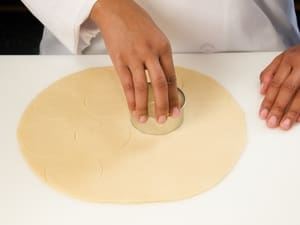 Using a 3 inch diameter cookie cutter, cut circles from the pie crust. Each pie crust should yield 10 circles. Combine dough scraps, roll flat, and cut the remaining 4 circles.
