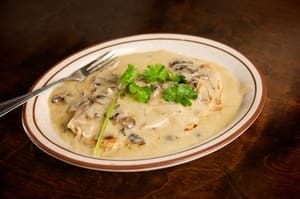 But the food really is the focus, from the tableside guacamole to the speciality margaritas, to the mole, to the Gallo al Conac™ (pictured, left). It’s a chicken breast pan-fried, sauteed in olive oil, lemon juice, mushrooms, a bit of sour cream, onions, and “my mom’s secret spices” plus a little cognac (and, yes, the spelling in the trademarked menu item is intentionally different).
