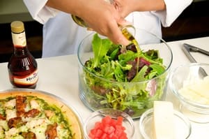 Toss salad greens with olive oil and vinegar.