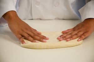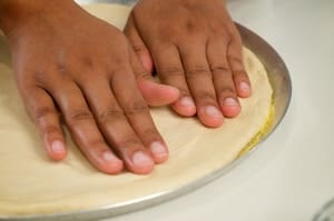 Spread pizza dough using your fingers.
