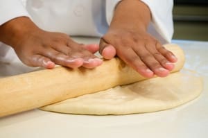Using a rolling pin, continue to roll pizza dough to desired size (approximately 12’-14’).