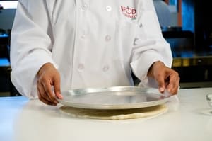 Use your pizza pan as a guide to determine the size. Dust the pizza pan with corn meal.