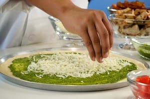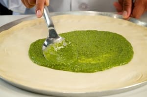 Evenly spread ¼ cup of pesto sauce onto the pizza dough.