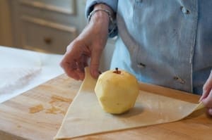 | Roll pastry dough to a thickness of no more than 1/8 inch. Cut into 8 squares, then cut each square into a triangle. Place apple in center of the triangle. | ![]() |