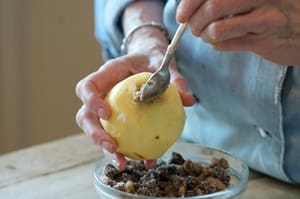 Core the apples carefully starting from the bottom to within 3/4 inch of the top. Take care to leave stems intact. |