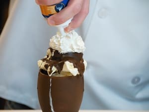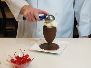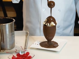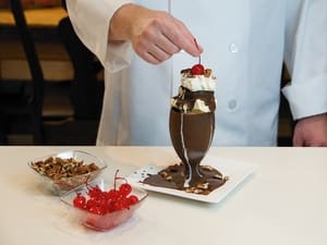 Because Dennis is preparing a larger quantity of sundaes, he’s using a container to dunk the goblets into the Magic Shell. For a small quantity, you can simply drizzle it onto the glass to achieve the desired coating. After coating, be sure to get the goblets into the freezer quickly so the shell can harden. Place goblets on a plate or cookie sheet lined with waxed paper.