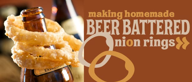 For best results, have everything set up assembly-line style before you start frying. Arrange bowls of drained buttermilk-soaked onion rings, seasoned flour and beer batter on the counter, along with a baking rack layered on a sheet pan to drain battered onion rings.