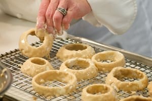 Drain excess beer batter on baking rack.