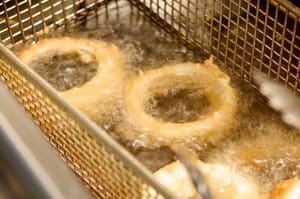 Carefully lower onion rings, one at a time, into hot oil (do not overcrowd).
