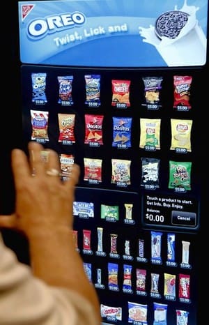 Instead of an array of plastic-wrapped foods behind a clear plastic window, Kraft’s Diji-Touch machine presents images of those snacks on a 46-inch LCD screen. Tap the image and it enlarges, like on an iPhone. Brush the screen, the item swivels (like on an iPhone), enabling you to peruse the ingredients or nutritional data. A Kraft marketing manager noted that this is about the first new thing that’s happened to vending machines in decades.