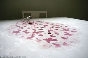 The tablecloth looks like a conventional white tablecloth with a subtle floral pattern until a liquid is spilled on it. When stained with something like red wine, the material absorbs the spillage and turns it into a pretty pattern of flowers or butterflies.