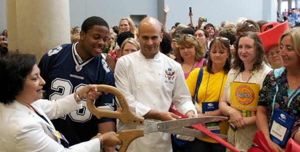 More than 5,000 school nutrition professionals paraded into the Dallas Convention Center Monday as the exhibition hall opened for the School Nutrition Association’s Annual National Conference (ANC). A pep rally led by the Dallas Cowboy Cheerleaders and Cowboys running back Tashard Choice got the crowd fired up to see the latest school foodservice products for the coming school year.