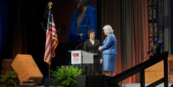Rivas looked back with pride on a year that found the association responding with a ‘food revolution’ of its own, including a vigorous social media campaign to get out the word about the healthy meals being served in America’s schools. ‘Serving fresh fruits and vegetables and whole grains is certainly nothing new to most of us,’ Rivas told the audience. Rivas talked about her excitement over meeting with First Lady Michelle Obama and getting involved in her Let’s Move! initiative.