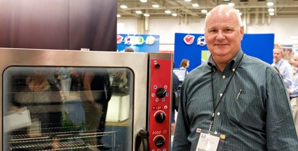 The Food Channel crew took a brief break from eating and visited some of the equipment vendors at this year’s ANC, including Rob Geile from Hobart, who talked about the company’s new energy-saving AM-15 dishwashing machine. We also met with Mike Burke from Vulcan (shown below) who showed us their new combi-oven, which cooks with steam or convection (or both).