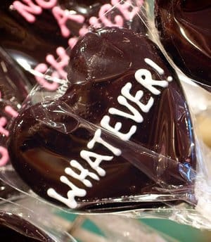 For the not-so-lucky-in-love, chocolate can usually take away the edge. Now, fresh from the Candy House, you can celebrate with the anti-valentine. It’s a big chocolate lollipop with endearments such as ‘Bite Me’ and “I Luv U Not” and “Not a Chance.”