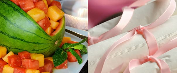The Watermelon and Cantaloupe Salad with Mint Vinaigrette can be served in the carved watermelon. The mint vinaigrette adds an extra bit of freshness for a hot summer afternoon.