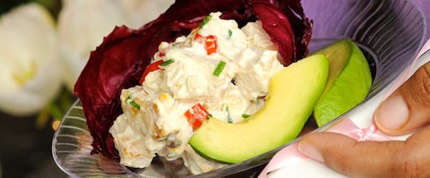The “Avocado Stuffed with Chicken Salad”:https://foodchannel.com/search?search%5Bsearch_term%5D=avocado+stuffed+chicken+salad&search%5Bsearch_type%5D=Recipe&x=11&y=11 is not your typical chicken salad. This recipe has shallot, red pepper, and chives to add some kick. Served in an avocado, guests will be impressed with the presentation.