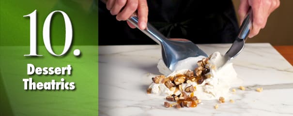 10. Dessert Theatrics. We all enjoy a little tableside theater when we’re enjoying a nice restaurant dinner. We’ve had the tableside prep of the Caesar salad and the fresh guacamole. It’s only natural that this has started to creep across the menu. It began with tableside s’mores, and Brennan’s in New Orleans is renowned for its tableside Bananas Foster. Now we’re seeing egg creams prepared tableside at Eleven Madison Park in New York. Alinea in Chicago does some amazing things, not just tableside, but table top, arranging an array of dessert ingredients on the table in front of the guests, who then can complete and customize the assembly of the dish. It’s dessert theater at its best.