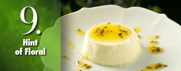 9. A Hint of Floral. Subtle hints of floral have begun to sprout up in the dessert category. We’re seeing lavender, especially, with little touches of it in baked goods such as cupcakes and macarons. You can find lavender syrups, and lavender-infused sugars in teas and yogurts served in some restaurants. Even a chain as mainstream as Ruby Tuesday has introduced a new lavender lemon drop cocktail. Edible flowers, always popular as a garnish, are coming back in vogue as part of the aromatic and flavor experience.