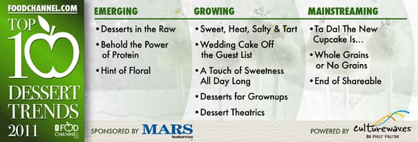 The Food Channel® presents its Top Ten Dessert Trends for 2011. The list is based on research conducted by The Food Channel in conjunction with CultureWaves®, the International Food Futurists® and Mintel International.