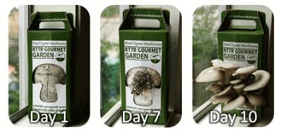 To get fresh, tasty Pearl Oyster Mushrooms, you just put the Easy-to-Grown Mushroom Garden on a windowsill and mist it a couple times a day with the provided mister. Within 7 days or so, little mushroom pinheads start popping out of the window that’s on the front of the package. Then the mushrooms really start growing—doubling in size every day, according to the BTTR Gourmet Garden people.