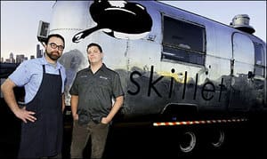 Rather than pay rent somewhere in the city, Skillet serves its customers out of a 1962 Airstream trailer parked on Seattle’s streets and parking lots, offering burgers made from grass-fed Kobe beef topped with cambazola cheese, bacon jam and arugula…or a porchetta sandwich-style with crisp shallots and lemon-rosemary aioli on rosemary bread…or for dessert, a brittle puff pastry ganache.