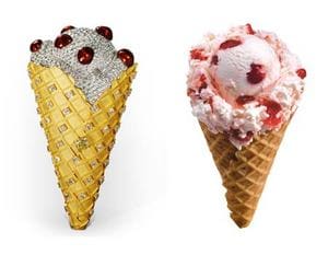 As reported on Google Images, Bruster’s Real Ice Cream has inspired the world’s first $1 Million ice cream cone, based on their signature waffle cone. It has white and yellow gold, diamonds, and who knows what else. In case you couldn’t tell, the diamond-edition is on the left; Bruster’s on the right.