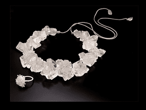 It’s a sweet story: This jewelery is spectacular, and made out of sugar. Using a natural substance and growing it into a usable, wearable piece of art is what we call Green Echo, because it echoes a natural environment. So, your sweetie can’t afford diamonds. Who cares, with this fun version of a rock.
