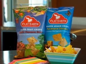 Flat Earth Baked Crisps come in 6 varieties. We sampled three: Farmland Cheddar Baked Veggie Crisps; Apple Cinnamon Grove Baked Fruit Crisps; and Tangy Tomato Ranch Veggie Crisps.