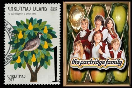 Alternative: How about a CD, A Partridge Family Christmas Card, taped to a gift box of Royal Riviera Pears from Harry and David?