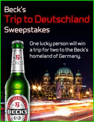 One of America’s most popular German imports, Beck’s Beer, is celebrating Oktoberfest by offering customers a chance to win an 8-day, 7-night ‘Trip to Deutschland.’ Winner may choose from four German destinations: Bonn, Berlin, Frankfurt or Munich. Sweepstakes ends December 31, 2008.