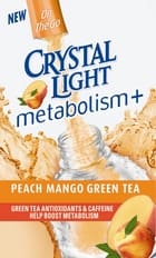 - Metabolism+ Peach Mango Green Tea contains a blend of natural green tea antioxidants and caffeine for a short-term boost in metabolism. It’s also a good source of Vitamins C and E.