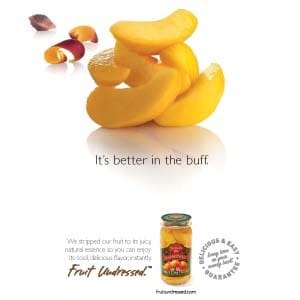 The print and online campaign features glamour shots of the fruit ‘in the flesh’ such as a just-peeled peach, with the provocative headline ‘It’s better in the buff.’ A mango unveils ‘the Full Monty’ after removing its skin.
