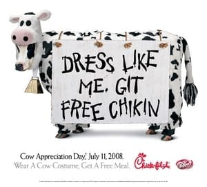 “Cow Appreciation Day gives our customers the opportunity to have some fun as we reinforce the sustainability of our brand icon,” said Michael McCathren of Chick-fil-A’s interactive digital marketing group.