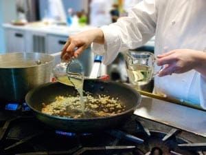 Add lemon juice and wine; as mixture comes to a boil, add 2 tablespoons butter and stir until melted.